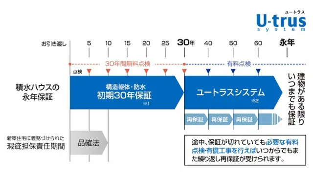 さらに、定期点検と必要な有償メンテナンスを行うことで、保証を延長できる仕組みがあります。結果として、建物が存在する限りサポートを受けられる体制になるのが特徴です。